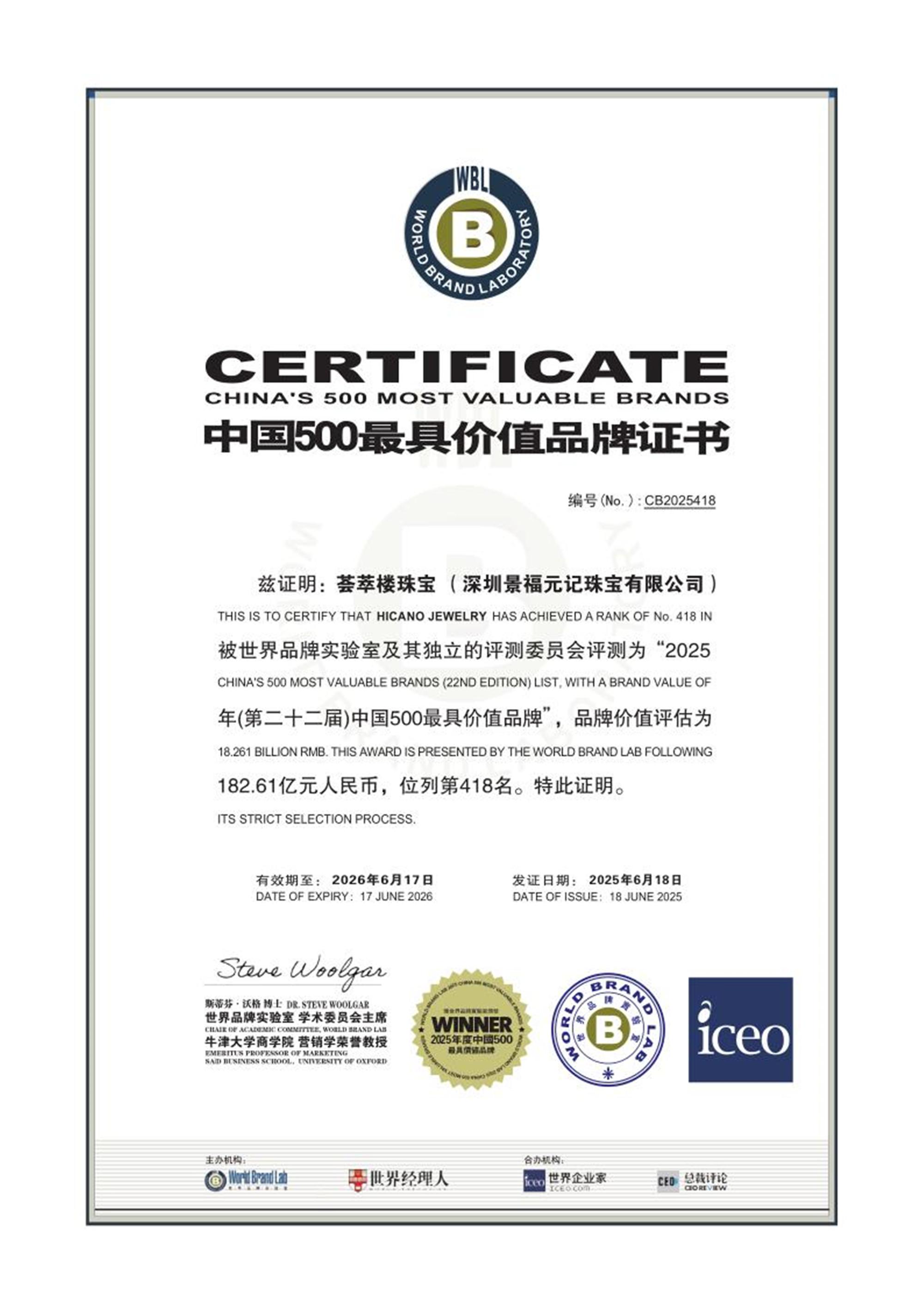 6月18日,由世界品牌實驗室(World Brand Lab)主辦的2025年(第二十二屆)世界品牌大會,暨中國500最具價值品牌發布會在北京召開。會上發布了2025年《中國500最具價值品牌》分析報告,薈萃樓珠寶憑借182億元人民幣的品牌價值入選榜單,位列第418名,與國家電網、海爾、騰訊、周大福、周大生等眾多品牌共同入圍榜單,充分體現了其行業影響力和代表性。