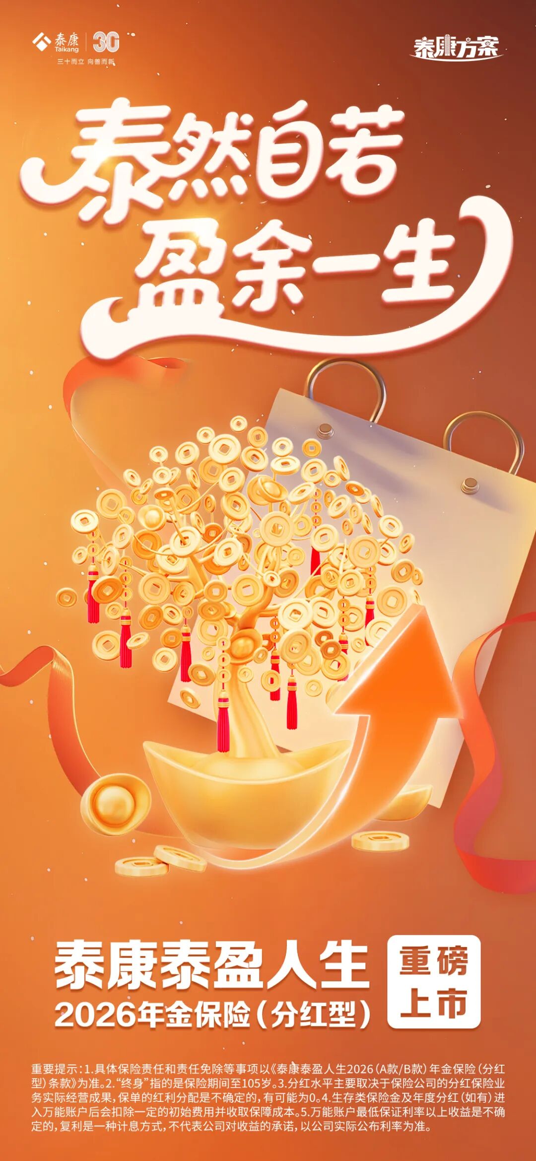 1、具體保險責任和責任免除等事項以《泰康泰盈人生2026(A款)年金保險(分紅型)》、《泰康泰盈人生2026(B款)年金保險(分紅型)》、《泰康添福2026終身壽險(萬能型)》、《泰康瑞贏2026終身壽險(萬能型)》、《泰康福泰2026優選終身壽險(萬能型)》、《泰康尊贏2026優選終身壽險(萬能型)》等條款為準。泰盈人生2026產品計劃包括年金險、萬能險等,主險可單獨購買;