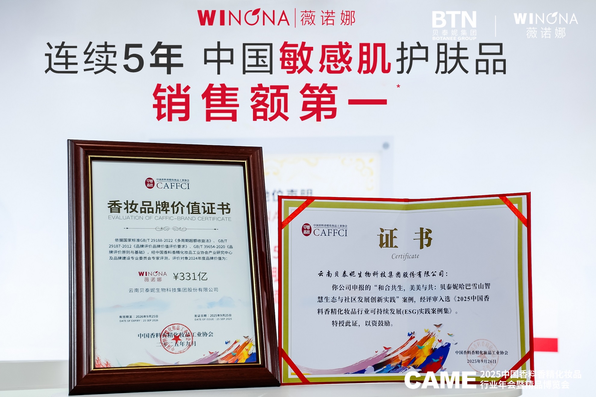 今年8月,經(jīng)權(quán)威機(jī)構(gòu)沙利文認(rèn)證,薇諾娜已連續(xù)五年(2020-2024)在中國(guó)敏感肌護(hù)膚品銷售額第一,這不僅體現(xiàn)了消費(fèi)者的高度認(rèn)可,也印證了品牌經(jīng)歷多年深耕積累的專業(yè)壁壘。此次大會(huì)中,貝泰妮集團(tuán)在可持續(xù)發(fā)展及品牌價(jià)值建設(shè)領(lǐng)域再獲加冕,斬獲三項(xiàng)權(quán)威認(rèn)證:貝泰妮集團(tuán)榮獲「2025中國(guó)香料香精化妝品行業(yè)可持續(xù)發(fā)展(ESG)實(shí)踐案例集」證書(shū),薇諾娜榮獲2024年度「香妝品牌價(jià)值證書(shū)」,并入選“2025化妝品品牌50強(qiáng)”。