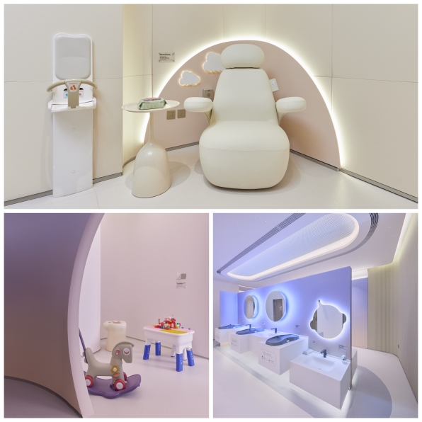步入鄭州機場母嬰室內,媽媽們的第一感受是被寧靜和放松包裹。潔凈的白、柔和的光,在低明度和低飽和度色彩下,新母嬰室的氛圍溫和恬靜,空間分區逐步從開放過渡到私密,讓媽媽們更安心放松,也能讓爸爸在內的家庭成員們參與喂食、換尿布,實現真正的“全員育兒”。