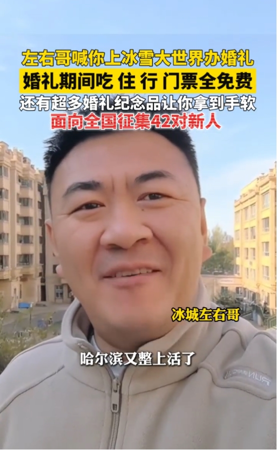 深受哈爾濱市民喜愛的本土“人氣王”冰城左右哥,則用幽默親切的方式發出邀約:“哈爾濱又整上活兒了,這回呢,要為全國的新人辦一場超級浪漫的冰雪集體婚禮,這個機會可遇不可求,不管你是在天南還是在海北,只要你和Ta想擁有一個不一樣的婚禮,趕緊來報名,把你們的愛和誓言在這冰天雪地里一起封存,和他一起留下這難忘的浪漫回憶。”左右哥接地氣的話語,拉近了與新人的距離,也讓更多人感受到了哈爾濱人的熱情與豪爽。