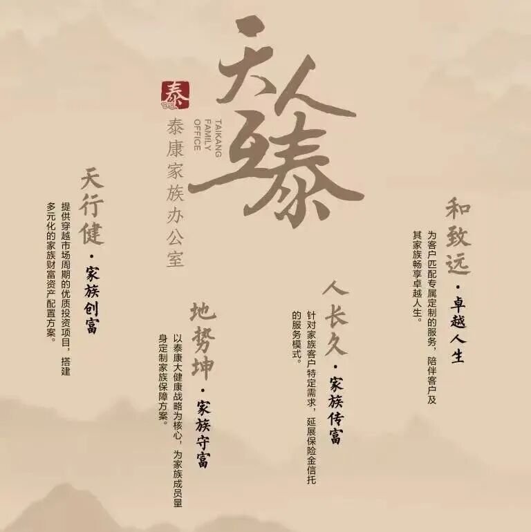 未來,泰康家辦將不忘初心,繼續秉持“守正出新,行穩致遠”的理念,以“天地人和,泰然美好”為愿景,持續深化“支付+服務+投資”生態融合,優化服務體系,成為中高凈值家族財富傳承與美好生活的堅實伙伴,助力家族實現健康無憂、財富永續、家族興旺。