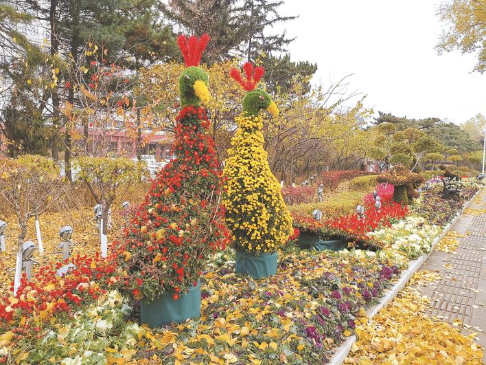 10月31日,在長春市新民廣場附近,雖然秋風正掃落葉,但路旁的花卉依然色彩鮮艷、景色宜人,顯得生機勃勃?,F場通過冷暖花色的有機組合,以簡約明快的線條和圖形組成各種層次豐富、靈動多彩的圖案,有漂亮的“孔雀”、呆萌的“小熊”、高高的“蘑菇”……
