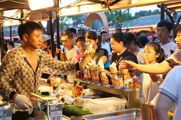 燈火璀璨的夜游盛宴,超高顏值的商業(yè)街區(qū),打造出極致的超感官視聽盛宴。步入美食區(qū),誘人的香氣一陣陣撲鼻而來,陜西羊肉泡饃、南京鴨血粉絲湯、長沙火宮殿臭豆腐、河間驢肉火燒、重慶酸辣粉、廣東腸粉、黃鶴引涼茶等美食應接不暇……游客在這里邊聊天邊品美食、看表演,踩著音樂的節(jié)拍,歡聲笑語此起彼伏,濃濃的煙火氣被賦予上“夜經(jīng)濟”的獨特魅力。